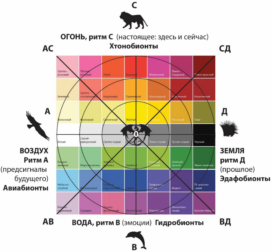 Энергетические ритмы способны меняться местами в разном возрасте и в разном состоянии – у разных эйдотипов. (Когда мы влюблены, включается ритм А. Когда мы заняты важным проектом – ритм Д, когда нам надо расти по карьерной лестнице – ритм С, когда кого-то теряем или проходим испытания – может включиться ритм В… и т.д.)