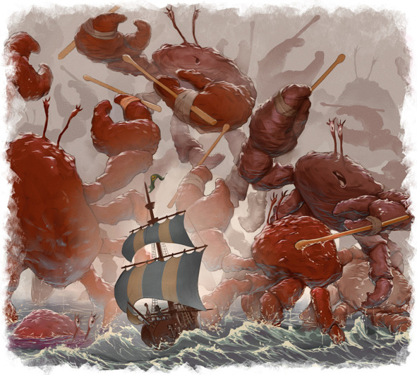 Рифовые крабы выползали из воды, обступая «Джоконду». Тут один из них воздел к небу огромную клешню и обрушил её в воду. Поднявшаяся волна захлестнула корабль вместе с парусами.