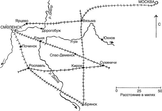 2 октября немецкие войска прорвали советскую линию обороны севернее и южнее Смоленска. Бронетанковые части, являвшиеся створками немецких клещей, соединились вблизи Вязьмы 7 октября. В образовавшемся котле оказалось большое количество регулярных советских войск, а также значительная часть гражданского населения. Часть территории котла была завоевана немцами еще в июле и августе. Вот что сообщалось в донесении 3-й танковой армии немцев: «После начала наступления 2 октября войска вошли в район, весьма своеобразно подготовившийся к войне: население неделями использовалось на земляных работах и не имело возможности собрать урожай картофеля и провести осенний сев; колхозный скот был угнан практически повсеместно; собранный урожай и крупные здания, такие как школы, клубы и другие общественные здания, были сожжены…»[4]