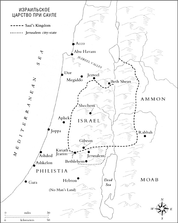 Саул правил на большей территории, чем любой ханаанский правитель до него. Его царство включало центральные нагорья по обе стороны реки Иордан, к северу от города-государства Иерусалима, остававшегося иевусейским. В Библии Саул – фигура трагическая: царь, наказанный Богом за то, что осмелился проявлять инициативу в вопросах жертвоприношения, мучимый приступами невыносимой тоски и видящий, как день за днем слабеет его власть. Но даже из этого довольно критического повествования можно сделать вывод о впечатляющих достижениях Саула. Сделав столицей город Гаваон, где располагался самый почитаемый в Израиле храм Яхве, Саул последовательно расширял свое царство, и жители холмов добровольно признавали его власть. Почти два десятилетия он успешно защищал Израиль от врагов, пока около 1010 г. до н. э. не погиб вместе с тремя сыновьями, среди которых был и храбрый Ионафан, в сражении с филистимлянами при горе Гильбоа (Гелвуй). После смерти его имя и его доблесть были воспеты в одном из самых трогательных стихотворных фрагментов Библии: