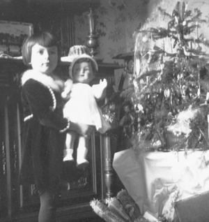 Mrs. Koch, wearing a wonderful lace dress with a long, three-row necklace, sat next to me. Speaking in French, she said: “Simone, Father Christmas (Père Noël) has brought something for you.” And taking my hand, she led me to the beautifully adorned pine tree standing opposite a big lace-covered table. The crystal glasses and silverware reflected the dozens of candles on the tree. This fascinated me more than searching for my gift among the many packages under the tree.