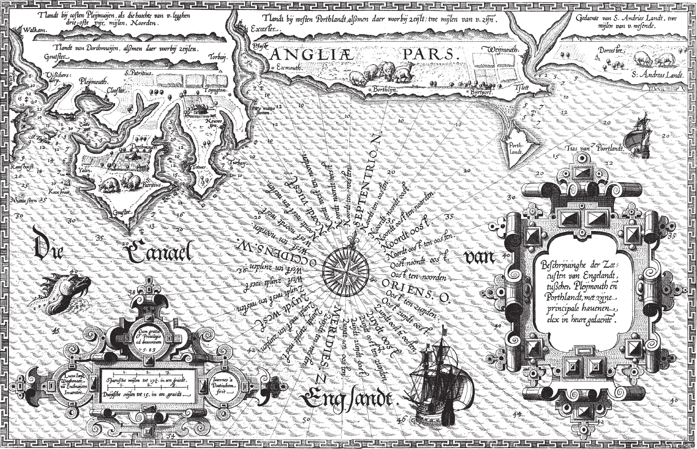 Навигационная карта Ла-Манша и побережья Англии от Плимута до Веймута 1583 г. Из первого тома морского атласа «Зеркало мореплавания» (1584) Лукаса Вагенера