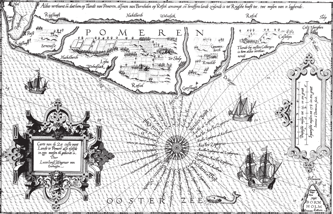 Навигационная карта Балтийского моря, северного побережья Польши (в то время часть Померании) и датского острова Борнхольм, ок.1583 г. Из второго тома морского атласа «Зеркало мореплавания» (1585) Лукаса Вагенера. (Карта ориентирована юго-востоком кверху.)