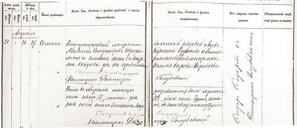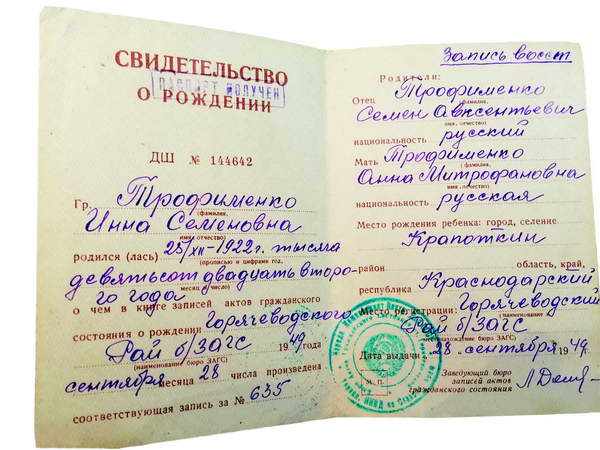 В архиве современного украинского города Днепр (бывш. Днепропетровск, Екатеринослав) нашлись метрические записи о рождении и крещении в апреле 1886 года Симеона Трофименко, в 1891 году – его брата Фёдора [889] 2-го (что предполагает наличие и старшего сына Фёдора в семье), записи о венчании Фёдора в 1913 году с мещанкой же из Екатеринослава девицей Натальей Захаровной Круц[890] и рождении у них в следующем, 1914 году, сына Льва, племянника Семёна[399][378].