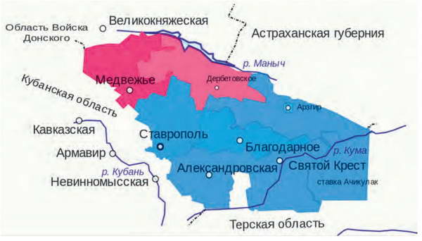 Однако достигнутый успех не был долговременным. 19 мая 1918 года генерал Алексеев предъявил ультиматум Медвеженскому уездному Совету об упразднении власти Советов и сдаче оружия. Тогда красные создали Медвеженский фронт общей протяжённостью 180 километров, вошедший в дальнейшем в состав Северо-Кавказского фронта. Для его обороны было мобилизовано из бедных крестьян и рабочих Ставрополя до 10 тысяч бойцов, в том числе около тысячи из них были жителями села Медвежье[425]. В память об упорных боях Гражданской войны в 1957 году Медвежье было переименовано – в третий раз[426] за период советской власти – в село Красногвардейское.
