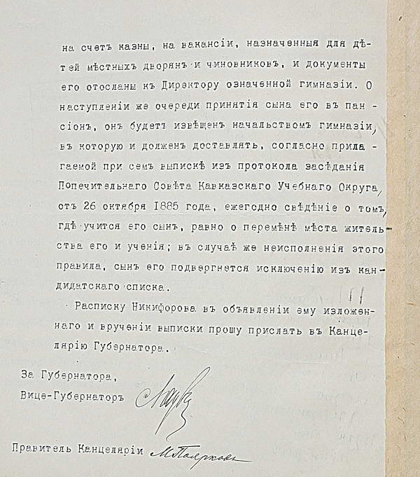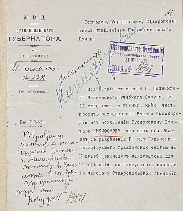 В метрической книге Ставропольского Кафедрального Собора церкви за тысяча восемьсот девяносто шестой год (1896 г.) 2-й части о бракосочетавшихся под № 60 значится следующая запись: вступил в брак десятого числа ноября месяца жених Канцелярский служитель Аркадий Васильевич Никифоров – первым браком 24 лет, невеста дочь Титулярного Советника Мария Федорова Кузнецова – первым браком 19 лет