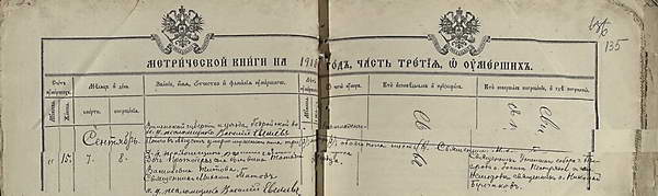 В метрической книге Ставропольского Кафедрального Собора церкви за тысяча восемьсот семьдесят седьмой год (1877 г.) в 1-й части о родившихся женского пола под № 86 значится следующая запись: родил ась тридцатого числа июля месяца Мария у нея родители: губернский секретарь Федор Семенов Кузнецов и жена его Екатерина Моисеева Акт подписал священник Орлов Выпись выдана по прошению гр. Никифоровой Гербовый сбор взыскан в сумме одного руб. – коп.
