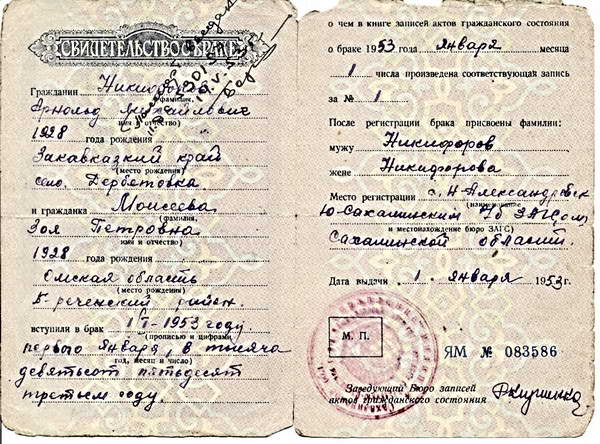 Свидетельство о браке А. М. Никифорова и З. П. Моисеевой