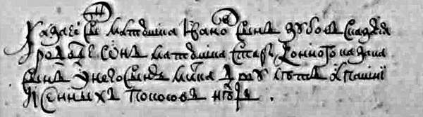 6-1: Казачей сын Матюшка Иванов сын Зубов сказался, родом де он, Матюшка, с Тары конного казака сын. У него сын Митька дву лет. А пашни и сенных покосов нет.