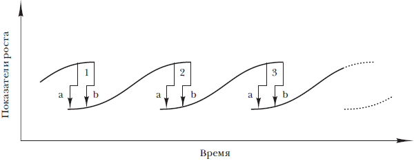 Так, наша последовательность частично пересекающихся системных циклов обнаруживает значительное формальное сходство с «метаморфозной моделью» социально-экономического развития у Менша. Менш (Mensch 1979: 73) отказывается от «представления о том, что экономика развивалась волнами, в пользу теории, что она развивалась через ряд прерывистых инновационных толчков, принимающих форму последовательных волнообразных циклов» (см. рис. 1). Его модель описывает фазы устойчивого роста в определенном направлении, чередующиеся с фазами кризиса, реструктуризации и турбулентности, которые в конечном итоге воссоздают условия для устойчивого роста.