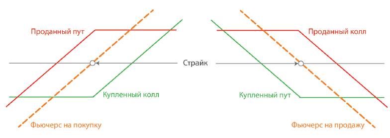 Несложно догадаться, что, комбинируя два инструмента, можно получить третий в виде синтетики. Например, продаем фьючерс, покупаем колл, получаем купленный пут. А покупая фьючерс и продавая колл, получаем проданный пут. И так далее.
