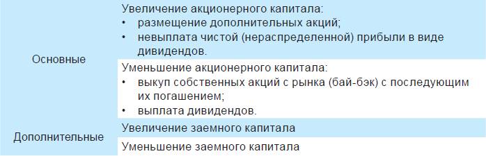 Возможные действия, связанные с управлением акционерным капиталом, имеющиеся в распоряжении компании: