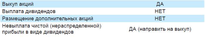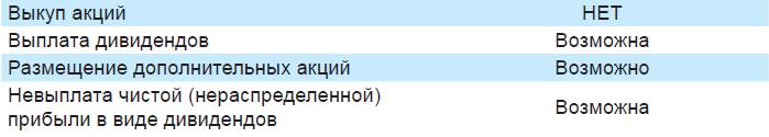 Компания может проводить выкуп за счет заемных средств, то есть компания может кредитоваться и выкупать собственные акции до момента, пока не нарушается одно из условий:
