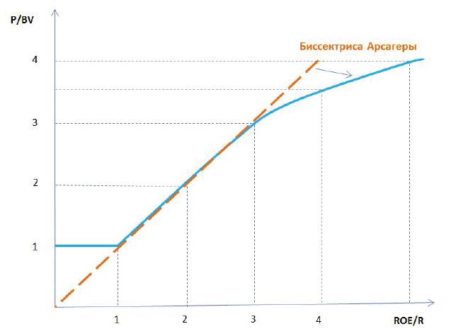 В зависимости от оценок прогнозный коэффициент P/BV как значение дроби ROE/Rт может приобретать нелинейный характер, то есть учитывать риски возможного снижения значения ROE, вследствие чего Биссектриса Арсагеры может принять следующий вид: