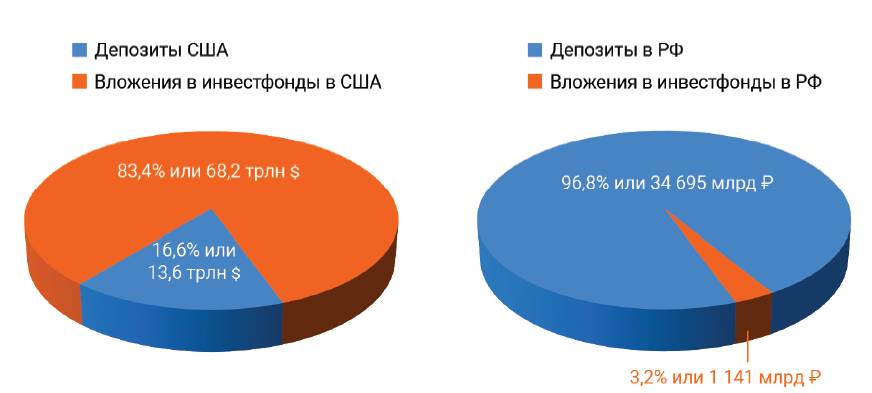 Соотношение вложений в инвестиционные фонды и депозиты в России и США, 2021 г.