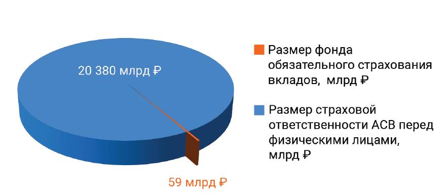 Объем страховой ответственности АСВ перед физическими лицами (по состоянию на начало 2021 года) составляет 20 380 млрд ₽ (если все банки объявят о банкротстве), а в фонде обязательного страхования вкладов – 59 млрд ₽. При этом размер обязательств по уже наступившим страховым случаям и повышению капитализации банков достигает 1 754 млрд ₽ и финансируется за счет взносов Российской Федерации.