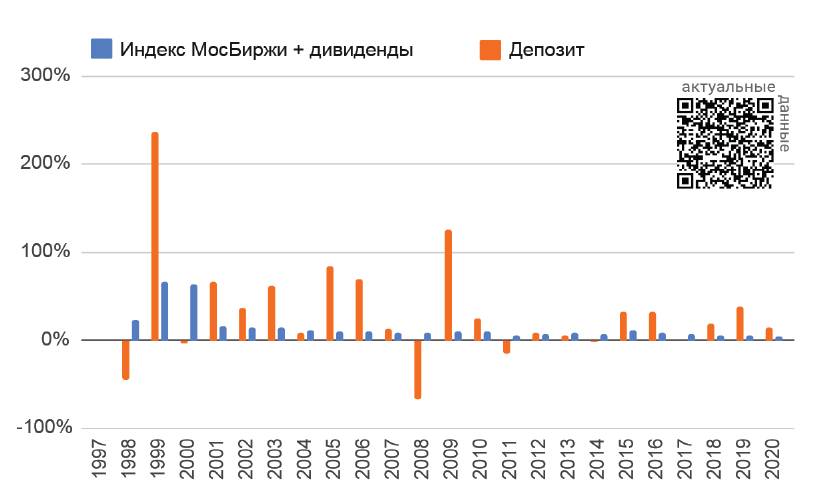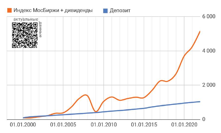Если бы вы в начале 2000 года положили на депозит 100 ₽ и вложили 100 ₽ в российские акции (индекс МосБиржи), то в конце 2021 года депозит с ежегодной капитализацией процентов смог бы обеспечить 1 041 ₽ (процентная ставка в каждом году равна средневзвешенной процентной ставке по депозитам в начале года). Российские акции с учетом реинвестирования дивидендных выплат могли принести 5 164 ₽. Даже в 2008 году стоимость ваших вложений была бы 437 ₽ против 405 ₽ на депозитах.