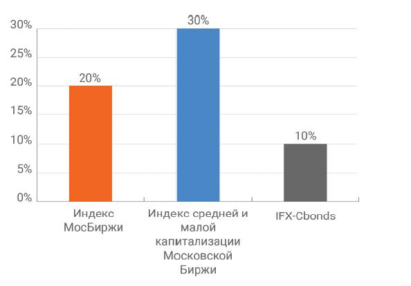 ΔI = 30% * Δ(Индекс МосБиржи) + 30% * Δ(Индекс средней и малой капитализации Московской Биржи) + 40%* Δ(IFX – Cbonds) = 19%.
