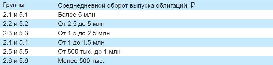 В рамках ранжирования облигаций для оценки ликвидности облигационного выпуска используются данные о среднедневном обороте сделок с облигациями на Московской Бирже за три месяца, предшествующие проведению ранжирования. В зависимости от группы, к которой относится облигационный выпуск по данному критерию, устанавливается ограничение на долю облигационного выпуска в портфеле, рассчитываемое как минимальное значение из лимита, установленного на суммарную долю облигаций эмитента данного выпуска, и значения, указанного таблице 8. При этом если две трети торговых дней за указанные три месяца относительная минимальная разница между спросом и предложением, вычисляемая путем деления разности лучших предложения и спроса за торговую сессию на полусумму лучших предложения и спроса за торговую сессию, составляла не более 1,5%, используется столбец 2 таблицы 8. В ином случае используется столбец 3 таблицы 8.