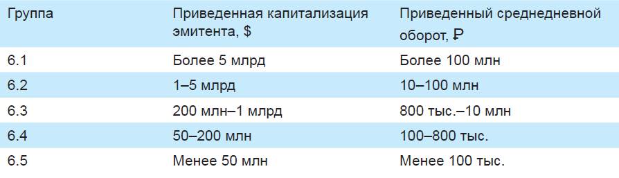 Обыкновенные и привилегированные акции одного эмитента рассматриваются и относятся к соответствующим группам раздельно, при этом критерий капитализации применяется к эмитенту в целом независимо от типа акций (то есть в качестве капитализации привилегированных акций берется значение капитализации обыкновенных акций).