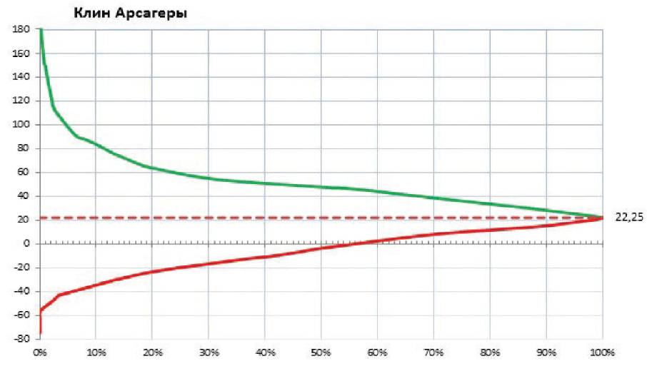 На графике зеленой линией соединены результаты портфелей из акций, показавших лучший результат, красной линией – портфели из акций, показавших худший результат, пунктирной линией – результат индекса МосБиржи. График, построенный таким образом, получил название «Клин Арсагеры».