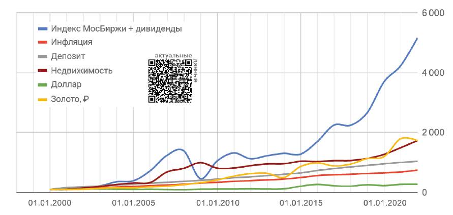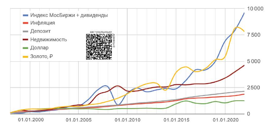 • График сравнения эффективности инвестиций за период с 1999 по 2021 год показывает, что инвестиции на фондовом рынке в определенные периоды могут значительно превосходить по результату остальные инструменты.