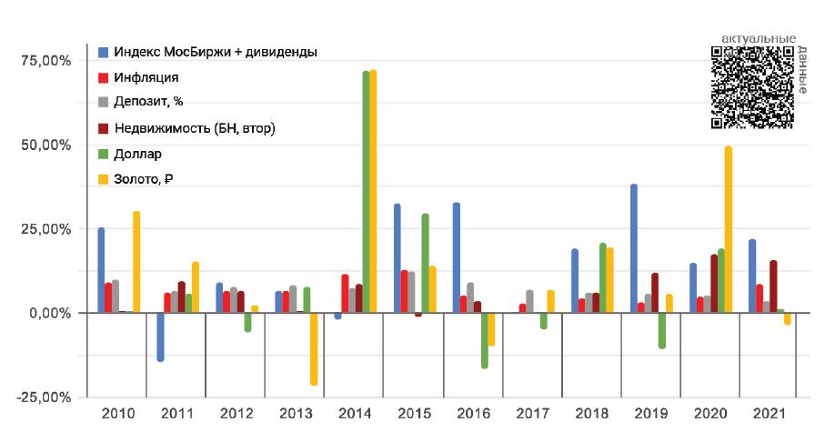В данном материале приводится обобщенный сравнительный обзор эффективности инвестирования в такие инструменты, как акции, недвижимость, депозит, золото, валюта. Приведенные расчеты не учитывают транзакционные издержки, связанные с приобретением и владением рассматриваемыми активами, что может оказать существенное влияние на фактическую доходность.