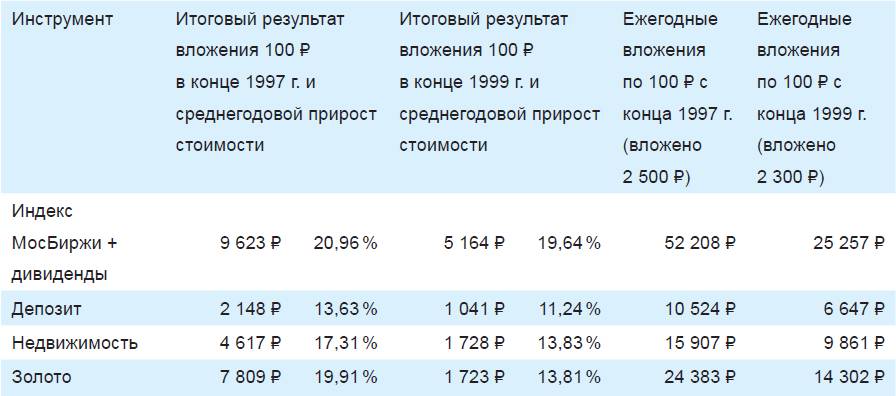 Давайте рассмотрим, каким именно образом дивидендная доходность по акциям скажется на расчетах при инвестировании 100 ₽ в конце 1997 года в индекс МосБиржи.