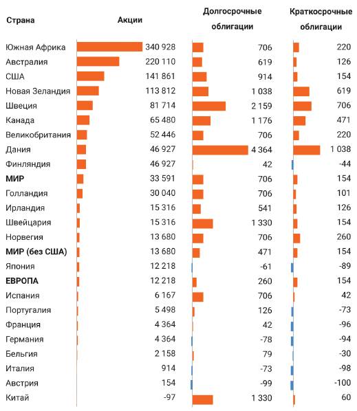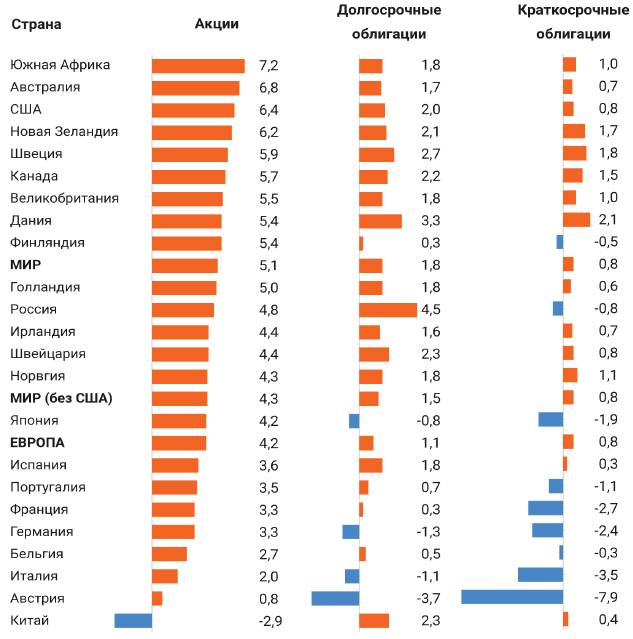 В данной таблице представлены сводные данные по доходности инвестиций с учетом инфляции (так называемая «реальная доходность») и реинвестирования доходов. За 117 лет (1899 ─ 2016) наибольшую среднегодовую реальную доходность продемонстрировали рынки акций Южной Африки (7,2%), Австралии (6,8%) и США (6,4%). Вложения в долгосрочные и краткосрочные облигации были наиболее эффективны в Дании (3,3% и 2,1% соответственно), Канаде (2,2% и 1,5%), Швеции (2,7% и 1,8%) и Новой Зеландии (2,1% и 1,7%).