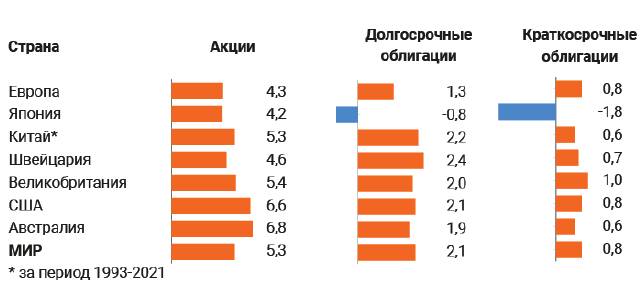 В среднем по миру (с учетом взвешивания по капитализации фондовых рынков) реальная доходность рынка акций составила 5,3%, долгосрочных облигаций – 1,9%, краткосрочных облигаций – 0,8%. В Европе данные показатели несколько ниже.