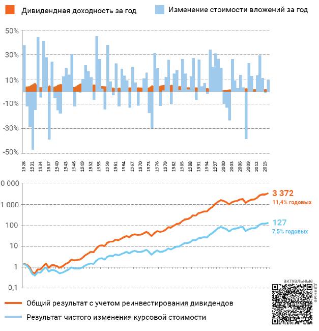 На следующем графике видно, что 1 доллар, вложенный в акции в США в 1928 году, в 2017 году превратился бы в 127 долларов без реинвестирования дивидендов и в 3 372 долларов с реинвестированием дивидендов.