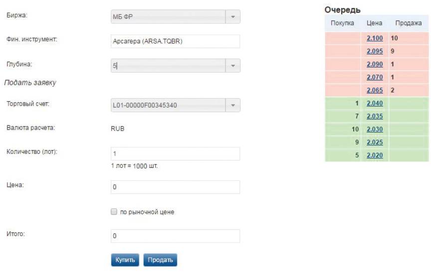 Общий принцип всех приложений по совершению сделок через Интернет состоит в том, что для проведения операций с ценными бумагами из общего списка надо выбрать нужную и кликнуть по ней. В открывшемся окне (на биржевом сленге оно называется «стакан») можно увидеть уже выставленные заявки на покупку и продажу. Это может выглядеть примерно так: