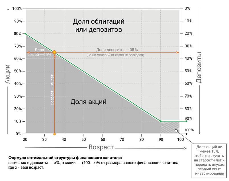 1. Держите на банковских депозитах Х%, а в акциях (100 – Х)% от размера своего финансового капитала, где Х – ваш возраст. Такая структура защитит ваши сбережения в молодости от потери покупательной способности из-за инфляции, а в старости снизит зависимость от колебаний стоимости акций.