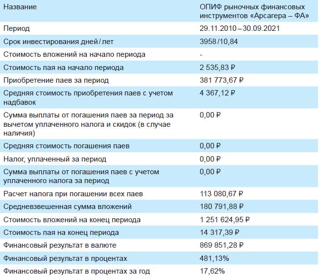 За 11 лет Мария сделала приобретений на 382 тыс. ₽. На 30.09.2021 года стоимость накопленного ею пакета паев (87,42 шт.) составила около 1 250 тыс. ₽.