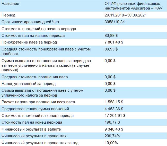 Сумма вложений составила 7 861 USD с учетом того, что вложения делались ежемесячно на протяжении почти 11 лет (каждое внесение пересчитывается по актуальному на тот момент курсу). Иначе говоря, сумма вложений в долларах существенно выше, чем текущая сумма вложений в рублях, деленная на текущий курс. На 30.09.2021 года стоимость накопленного Марией пакета паев оценивается примерно в 17 200 USD. Это соответствует доходности почти 11% в год, что существенно выше доходности валютных депозитов.