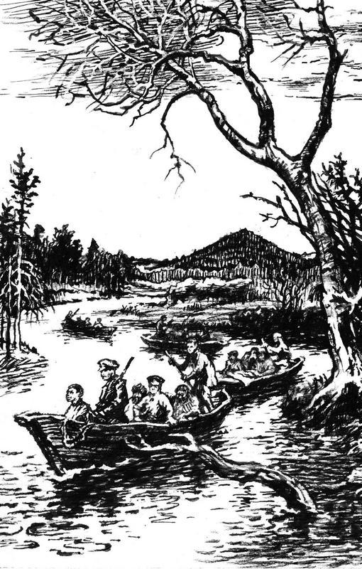 Когда я возвращался назад, уже смеркалось. Вода в реке казалась чёрной, и на спокойной поверхности её отражались пламя костра и мигающие на небе звезды. Около огня сидели стрелки: один что-то рассказывал, другие смеялись.