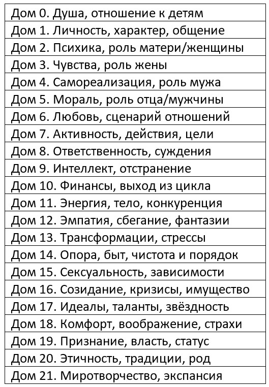 Всего в Карте 22 Дома. Каждый Дом охватывает определённые сферы, аспекты и категории взаимодействий с окружающими людьми, что делает Спираль Судьбы мощным инструментом в анализе социальных связей и отношений.
