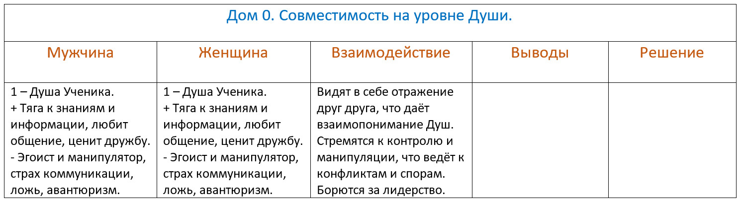 Заполняем Карту Совместимости партнёров. Сначала вносим данные во Внутренние Дома.