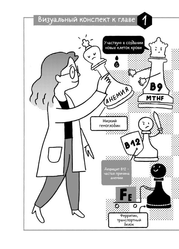 Мы познакомились с основными терминами, которые помогут нам говорить на одном языке. В конце этой книги вы найдете предметно-именной указатель, который подскажет, на какой странице искать описание каждого из этих и других терминов, если вы забудете, что они означают. Также мы расставили фигуры на воображаемой шахматной доске. Но прежде чем начать игру против белого короля-анемии, необходимо поставить правильный диагноз. Этим мы и займемся в следующей главе.