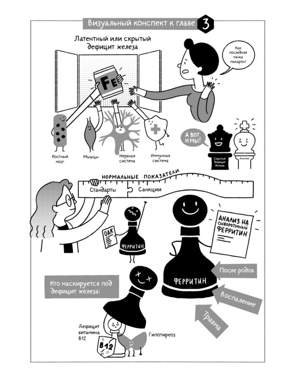 В большинстве случаев, чтобы подтвердить диагноз «дефицит железа», достаточно двух анализов. Первый из них мы подробно разобрали в предыдущей главе. Это общий анализ крови, который отвечает на принципиальный вопрос: есть у человека анемия или нет? Второй – анализ на сывороточный ферритин. Он отвечает на вопрос, есть ли у человека дефицит железа. И если ферритин ниже нормы, ниже 30 мкг/л, по данным большинства текущих рекомендаций для женщин и детей, то диагноз «дефицит железа» считается подтвержденным. Можно приступать к лечению. Однако нормальный и даже повышенный уровень ферритина не всегда означает, что дефицита железа нет.