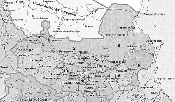 Округа и отделы Терской области: 1 – Нальчикский; 2 – Моздокский; 3 – Пятигорский; 4 – Осетинский; 5 – Ингушский; 6 – Веденский; 7 – Чеченский; 8 – Кизлярский; 9 – Хасавюртовский; 10 – Сунженский