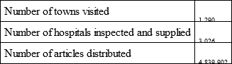 In addition, the Distributing Service has sent about 2,000 kilos of hospital supplies to the Serbs in the Lazaret of Frioul, off Marseille, and a similar quantity of material to the hospitals at Sidi-Abdallah (Tunis), and elsewhere in Tunisia and Algeria, given over to the treatment of Serbians.
