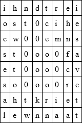 Here I handed Hewitt the pencilled note I had made at the hospital, with letters substituted for the figures, thus: —i, h, n, d, t, r, e, i; o, s, t, 0, c, i, h, e; c, w, 0, 0, e, m, n, s; s, t, 0, 0, 0, 0, f, a; e, t, 0, 0, 0, 0, c, v; a, o, 0, 0, 0, 0, r, e; a, h, t, k, r, i, e, t; l, e, w, n, n, a, a, t.