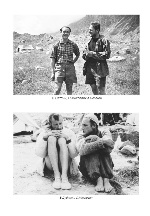 Кавказ, Безенги, лето 58 года. В то лето 58 г., в наш первый общий сезон в горах, приехали мы в Безенги, расселились, осмотрелись и поехала-понеслась наша горная жизнь. Для Бориса главной задачей в то время было найти четвертого человека в свою группу, поскольку с ним были только Олесь и Наташа; Шкрабкин приехать так и не смог. Боб присматривался ко всем нам, но колебался не долго – из всей компании «академиков» (так тогда нас называли) более всего ему понравился Игорь Щеголев. По-человечески это было более, чем понятно: Игорь Фомич был необыкновенно симпатичным человеком, с тонким чувством юмора и широчайшим кругозором. Но по своей конституции он выглядел немного тяжеловатым для прохождения сложных скальных маршрутов, и я, как один из тренеров сбора, не мог не поделиться этими сомнениями с Борисом. На что он ответил мне примерно в таком духе: «С таким душевным человеком, как Игорь, ходить в одной группе – это уже радость сама по себе, а где будет надо – я пролезу сам и всех вытяну». На том и порешили, и первым маршрутом для своей группы Боб избрал вершину Мижирги с перевала Селлы.
