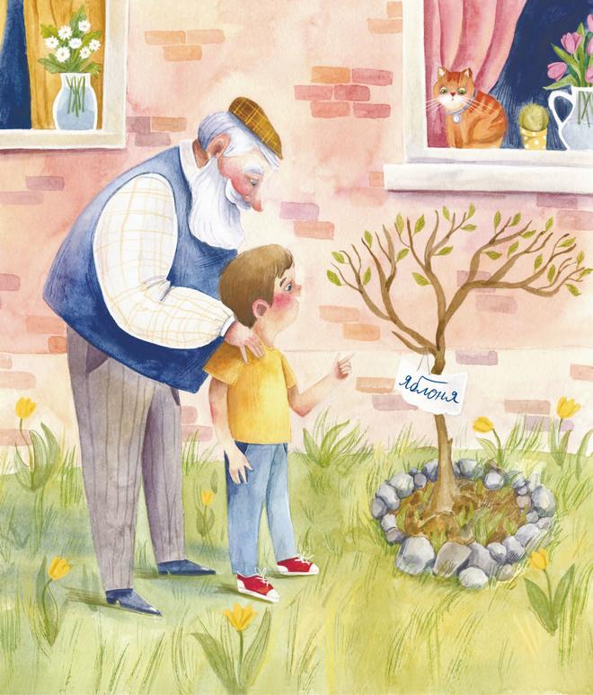 Я хорошо дедушку изучил, у него часто загадки в простых вещах прячутся. Видимо, в этот раз я должен был отгадать, какое дерево он посадил. Подошёл поближе, смотрю, а на тонком стволе бумажка с названием «Яблоня». Я тогда подумал: «Ну как же можно загадки загадывать и не подготовиться? Даже бумажку с дерева не убрать!» Решил ещё немного помолчать, сделать вид, что не увидел название, чтобы дедушке приятно было, а потом говорю: