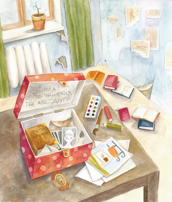 В комнате стояли письменный стол и очень старый диван с дыркой посередине. Из дырки торчала огромная пружина. Окно было целое. Это удивительно. Многие окна на первом этаже дома разбиты, а это сохранилось. Правда, оно было очень грязным. Когда-то зелёные занавески теперь стали такого странного мутного цвета. На подоконнике стоял горшок с засохшей веточкой. На полу несколько книжек и тетрадок валялось. Всё в пыли. Я подумал, что это настоящий клад для художника! Такое специально не придумаешь. Это видеть надо. Хорошо, что мы с дедушкой сюда пробрались.