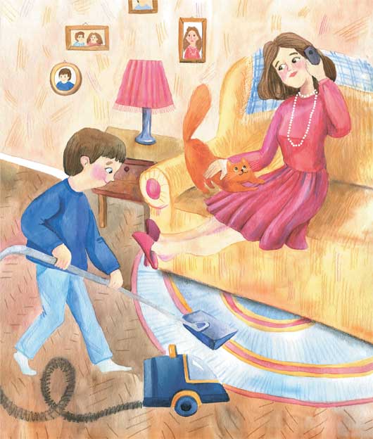 Вот тут у меня возникают вопросы к папе. Он же любит, когда мама радуется, и пылесосить он умеет. Когда мама неделю лежала в больнице, он всё делал сам: и уборку, и еду готовил, и посуду мыл. И ни разу не попросил ему помочь. Один раз я попробовал предложить помощь, но он меня быстро из кухни выгнал: «Исчезни, малой, не крутись под ногами».