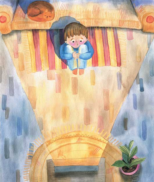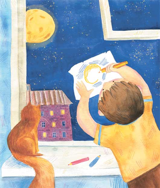 В беседке было классно! С одной стороны в неё попадал свет фонаря, а с другой светила луна. И всё равно было довольно темно, поэтому я почти наугад смешивал краски и рисовал не так, как дома бы при электрическом свете, а так, как было на самом деле, – загадочно. И дедушка точно знал, как поддержать, он просто рядом сидел и только краски и стаканчик с водой мне подавал, потому что краски у меня все в маленьких пластмассовых баночках, а палитру мне пока не купили. Рисую я по-своему: сначала кисточку делаю очень мокрой, чтобы краски прямо на бумаге красиво смешивались, а потом, когда первый слой подсыхает, я люблю почти сухой кисточкой взять краски пожирнее и вторым слоем пройтись по рисунку.