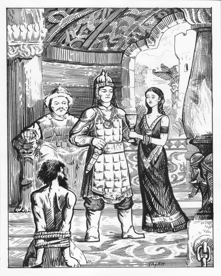 Спустя некоторое время я в сопровождении Угэ спустился в тронный зал Артавы, где на его престоле, стоящем на возвышенности, восседал Ирек. У его ног на коленях, на верхней лестничной ступеньке, ведущей к трону стоял истерзанный человек. Подойдя поближе, я по кровоточащим ранам понял, что это следы пыток.