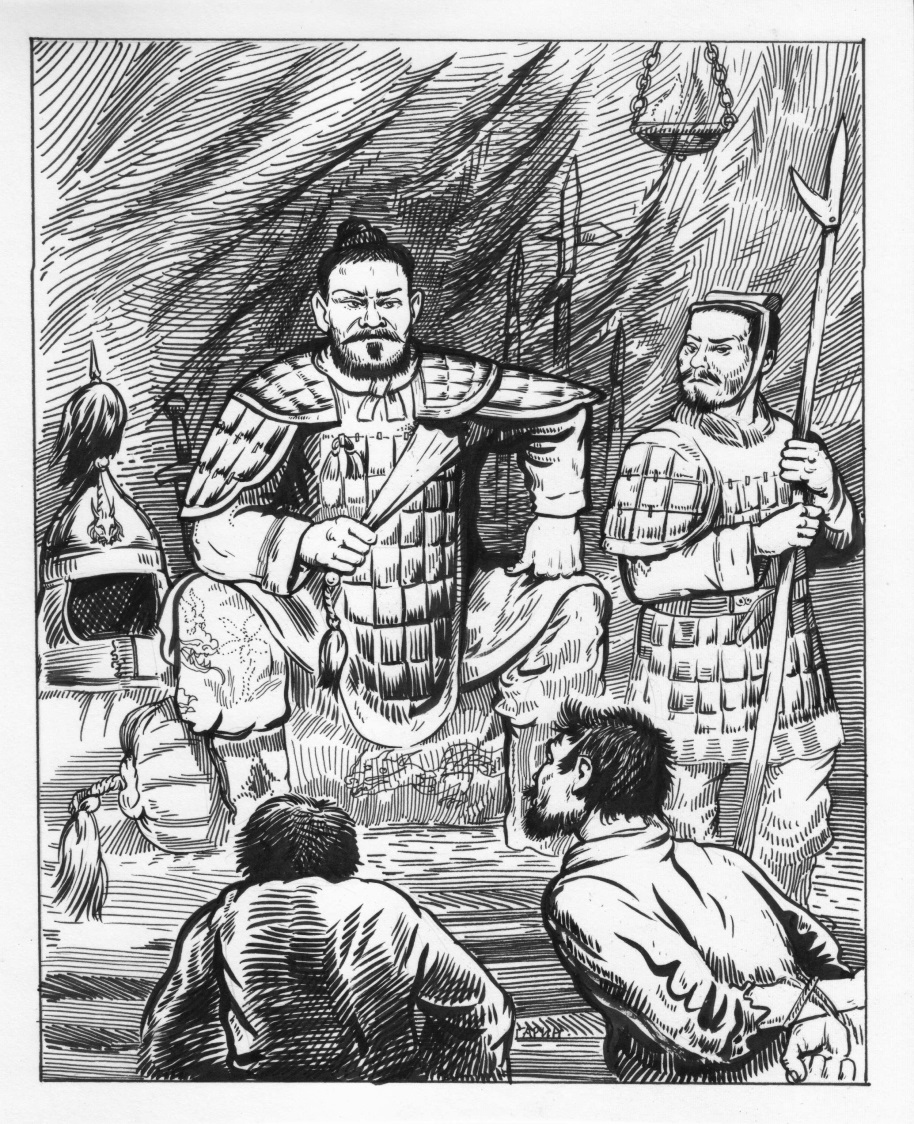 Спустя некоторое время в шатер втолкнули двух человек со связанными руками, которые, не дожидаясь того, что их поставят на колени, сами плюхнулись ниц перед Чен Таном. Генерал, даже не посмотрев на них, без всякого приветствия спросил на языке гуннов: